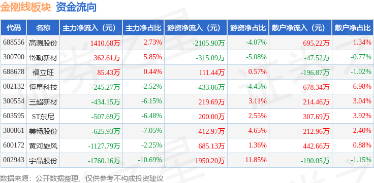 从资金流向上来看,当日金刚线板块主力资金净流出2842.26万元,游资资金净流入725.37万元,散户资金净流入2116.89万元。金刚线板块个股资金流向见下表: