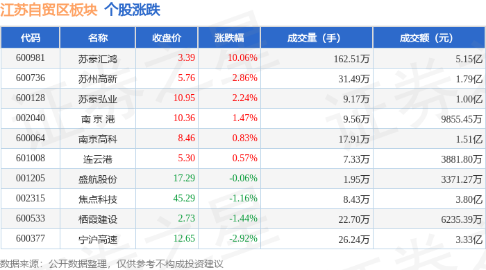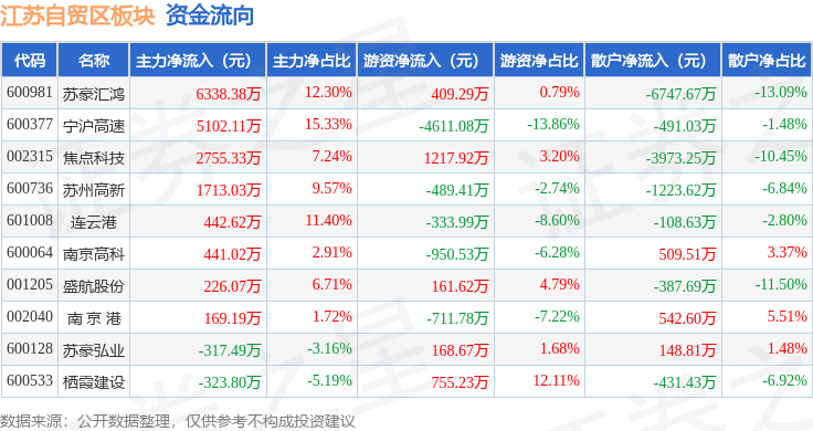 从资金流向上来看,当日江苏自贸区板块主力资金净流入1.65亿元,游资资金净流出4384.07万元,散户资金净流出1.22亿元。江苏自贸区板块个股资金流向见下表:
