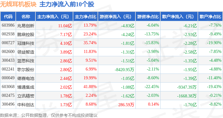 从资金流向上来看,当日无线耳机板块主力资金净流入50.22亿元,游资资金净流出23.07亿元,散户资金净流出27.16亿元。无线耳机板块个股资金流向见下表: