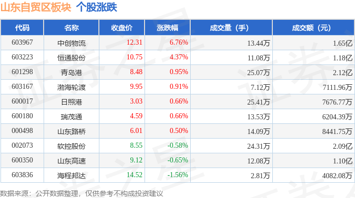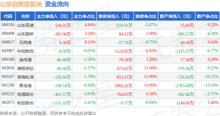 从资金流向上来看,当日山东自贸区板块主力资金净流出1295.2万元,游资资金净流入5733.71万元,散户资金净流出4438.51万元。山东自贸区板块个股资金流向见下表: