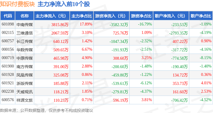 从资金流向上来看,当日知识付费板块主力资金净流出3.58亿元,游资资金净流入1.75亿元,散户资金净流入1.83亿元。知识付费板块个股资金流向见下表: