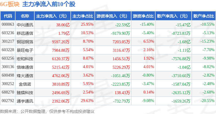 从资金流向上来看,当日6G板块主力资金净流入36.4亿元,游资资金净流出20.66亿元,散户资金净流出15.74亿元。6G板块个股资金流向见下表:
