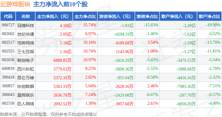 从资金流向上来看,当日云游戏板块主力资金净流出5.36亿元,游资资金净流入3642.24万元,散户资金净流入4.99亿元。云游戏板块个股资金流向见下表: