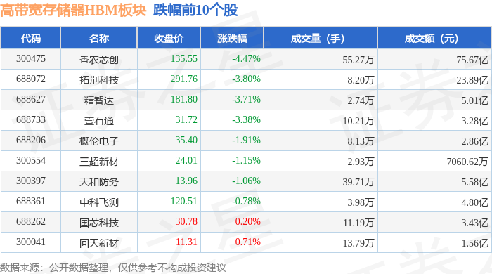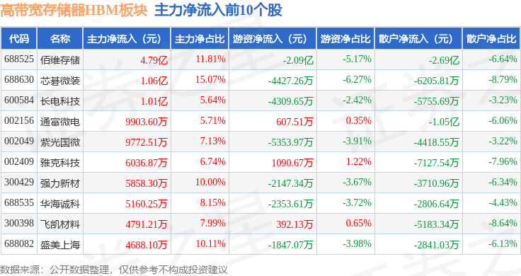 从资金流向上来看,当日高带宽存储器HBM板块主力资金净流入5.33亿元,游资资金净流出623.56万元,散户资金净流出5.27亿元。高带宽存储器HBM板块个股资金流向见下表: