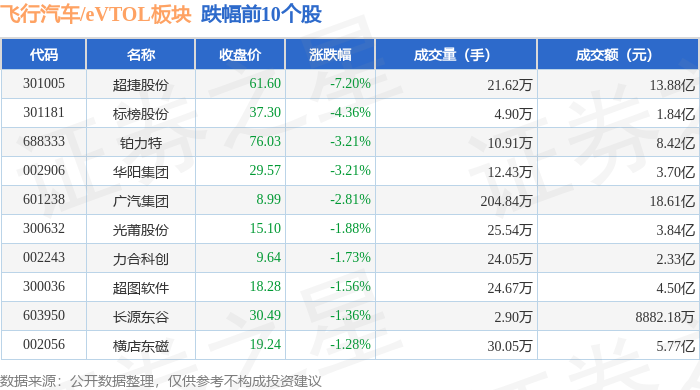 从资金流向上来看,当日飞行汽车/eVTOL板块主力资金净流出3.13亿元,游资资金净流入7853.47万元,散户资金净流入2.34亿元。飞行汽车/eVTOL板块个股资金流向见下表: