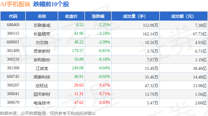 从资金流向上来看,当日AI手机板块主力资金净流入52.87亿元,游资资金净流出28.5亿元,散户资金净流出24.37亿元。AI手机板块个股资金流向见下表: