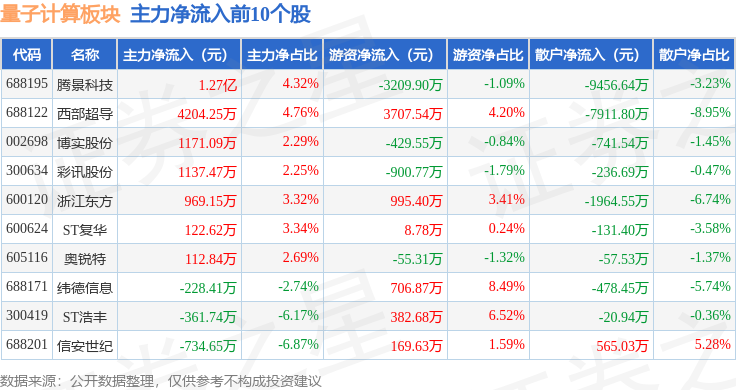 从资金流向上来看,当日量子计算板块主力资金净流出1.98亿元,游资资金净流入1.62亿元,散户资金净流入3572.61万元。量子计算板块个股资金流向见下表: