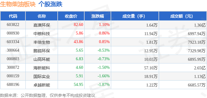 证券之星消息,12月1日生物柴油板块较上一交易日下跌0.45%,卓越新能领跌。当日上证指数报收于3914.01,上涨0.65%。深证成指报收于13146.72,上涨1.25%。生物柴油板块个股涨跌见下表: