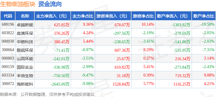 从资金流向上来看,当日生物柴油板块主力资金净流出2463.42万元,游资资金净流入2945.72万元,散户资金净流出482.3万元。生物柴油板块个股资金流向见下表: