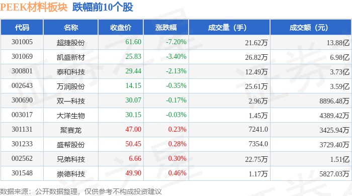 从资金流向上来看,当日PEEK材料板块主力资金净流入5.61亿元,游资资金净流出2.5亿元,散户资金净流出3.11亿元。PEEK材料板块个股资金流向见下表: