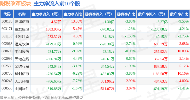 从资金流向上来看,当日财税改革板块主力资金净流出4.39亿元,游资资金净流入1.02亿元,散户资金净流入3.37亿元。财税改革板块个股资金流向见下表: