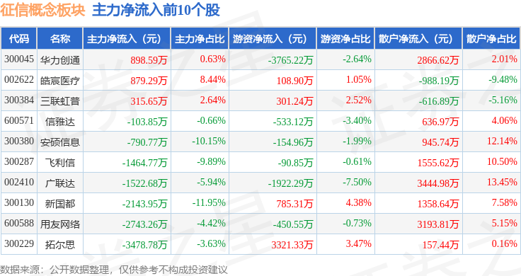 从资金流向上来看,当日征信概念板块主力资金净流出2.65亿元,游资资金净流入4940.16万元,散户资金净流入2.15亿元。征信概念板块个股资金流向见下表: