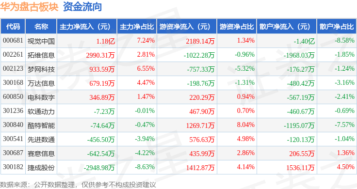 从资金流向上来看,当日华为盘古板块主力资金净流入1.27亿元,游资资金净流入4594.16万元,散户资金净流出1.73亿元。华为盘古板块个股资金流向见下表: