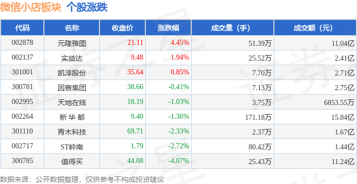 证券之星消息,12月1日微信小店板块较上一交易日下跌0.67%,值得买领跌。当日上证指数报收于3914.01,上涨0.65%。深证成指报收于13146.72,上涨1.25%。微信小店板块个股涨跌见下表:
