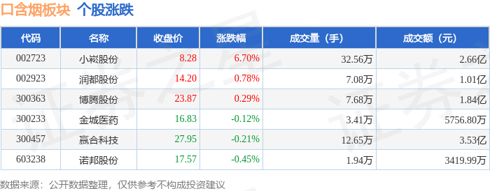 证券之星消息,12月1日口含烟板块较上一交易日上涨0.37%,小崧股份领涨。当日上证指数报收于3914.01,上涨0.65%。深证成指报收于13146.72,上涨1.25%。口含烟板块个股涨跌见下表: