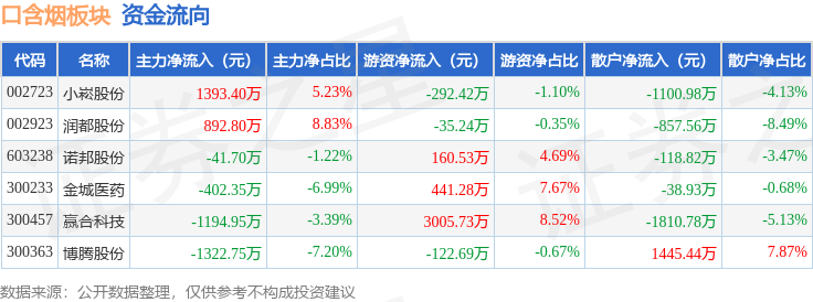 从资金流向上来看,当日口含烟板块主力资金净流出675.55万元,游资资金净流入3157.19万元,散户资金净流出2481.63万元。口含烟板块个股资金流向见下表: