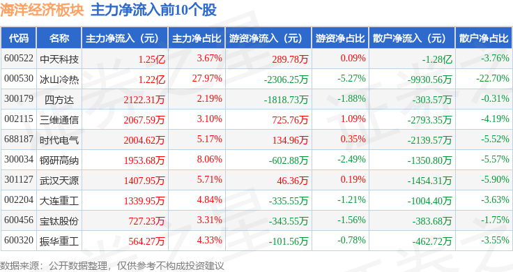从资金流向上来看,当日海洋经济板块主力资金净流出3.92亿元,游资资金净流入4656.02万元,散户资金净流入3.46亿元。海洋经济板块个股资金流向见下表: