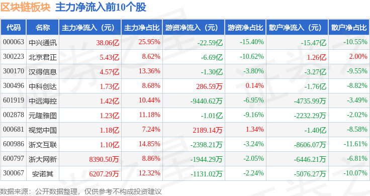 从资金流向上来看,当日区块链板块主力资金净流入10.27亿元,游资资金净流出26.56亿元,散户资金净流入16.29亿元。区块链板块个股资金流向见下表: