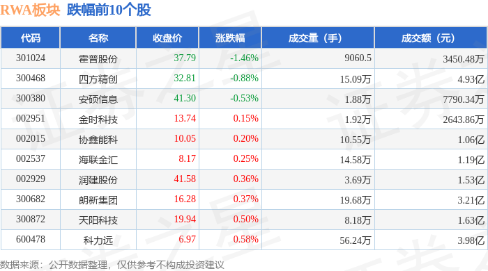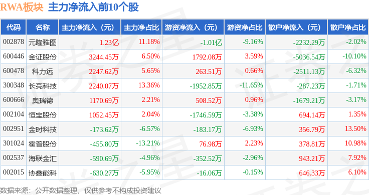 从资金流向上来看,当日RWA板块主力资金净流入6612.28万元,游资资金净流出9412.76万元,散户资金净流入2800.48万元。RWA板块个股资金流向见下表: