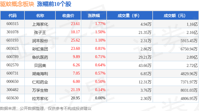 证券之星消息,12月1日驱蚊概念板块较上一交易日上涨0.27%,上海家化领涨。当日上证指数报收于3914.01,上涨0.65%。深证成指报收于13146.72,上涨1.25%。驱蚊概念板块个股涨跌见下表: