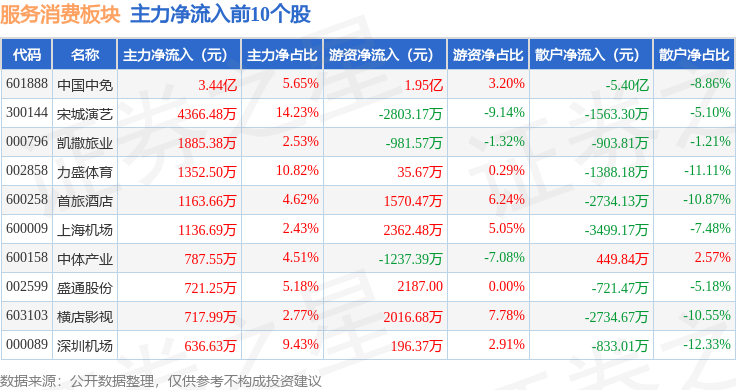 从资金流向上来看,当日服务消费板块主力资金净流入1.86亿元,游资资金净流入2.57亿元,散户资金净流出4.43亿元。服务消费板块个股资金流向见下表:
