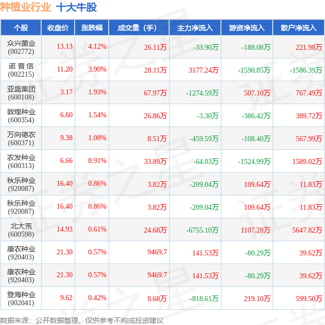 个股表现方面,种植业行业当日领涨股为众兴菌业(002772),该股当日报收13.13,上涨4.12%,成交量26.11万,主力资金净流出33.9万元。诺 普 信(002215)以上涨3.9%紧随其后,该股当日成交量28.11万,主力资金净流入3177.24万元。除此之外,亚盛集团(600108)、敦煌种业(600354)、万向德农(600371)均进入当日牛股之列。具体个股列表见下表:
