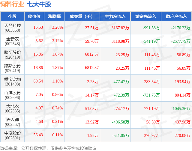 个股表现方面,饲料行业当日领涨股为天马科技(603668),该股当日报收15.53,上涨3.26%,成交量27.51万,主力资金净流入3167.82万元。金新农(002548)以上涨3.12%紧随其后,该股当日成交量59.7万,主力资金净流入3118.98万元。除此之外,路斯股份(920419)、路斯股份(920419)、乖宝宠物(301498)均进入当日牛股之列。具体个股列表见下表: