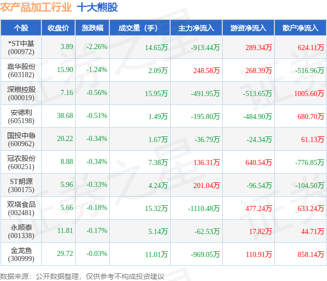 个股表现方面,农产品加工行业当日领跌股为*ST中基(000972),该股当日报收3.89,下跌2.26%,成交量14.65万,主力资金净流出913.44万元。嘉华股份(603182)以下跌1.24%紧随其后,该股当日成交量2.09万,主力资金净流入248.58万元。除此之外,深粮控股(000019)、安德利(605198)、国投中鲁(600962)均进入当日熊股之列。具体个股列表见下表:
