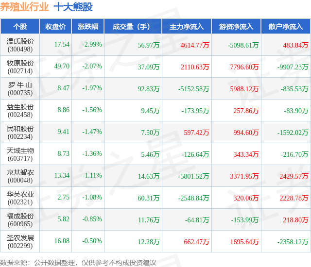 个股表现方面,养殖业行业当日领跌股为温氏股份(300498),该股当日报收17.54,下跌2.99%,成交量56.97万,主力资金净流入4614.77万元。牧原股份(002714)以下跌2.07%紧随其后,该股当日成交量37.09万,主力资金净流入2110.63万元。除此之外,罗 牛 山(000735)、益生股份(002458)、民和股份(002234)均进入当日熊股之列。具体个股列表见下表: