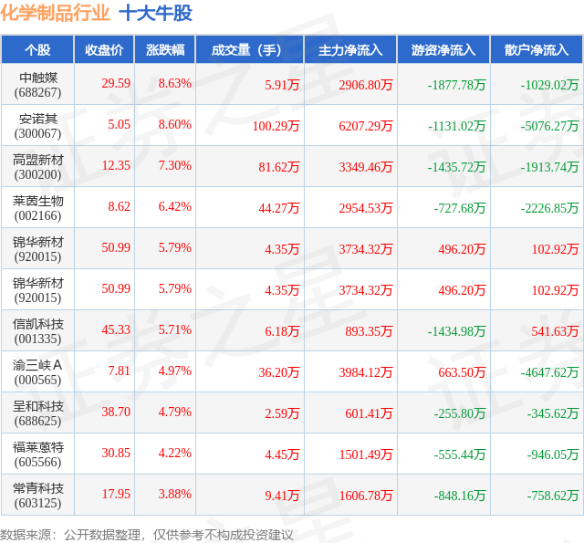 个股表现方面,化学制品行业当日领涨股为中触媒(688267),该股当日报收29.59,上涨8.63%,成交量5.91万,主力资金净流入2906.8万元。安诺其(300067)以上涨8.6%紧随其后,该股当日成交量100.29万,主力资金净流入6207.29万元。除此之外,高盟新材(300200)、莱茵生物(002166)、锦华新材(920015)均进入当日牛股之列。具体个股列表见下表: