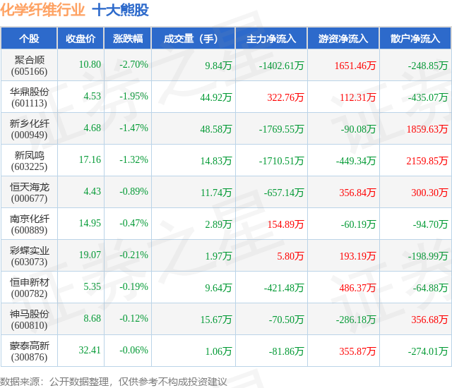 个股表现方面,化学纤维行业当日领跌股为聚合顺(605166),该股当日报收10.8,下跌2.7%,成交量9.84万,主力资金净流出1402.61万元。华鼎股份(601113)以下跌1.95%紧随其后,该股当日成交量44.92万,主力资金净流入322.76万元。除此之外,新乡化纤(000949)、新凤鸣(603225)、恒天海龙(000677)均进入当日熊股之列。具体个股列表见下表: