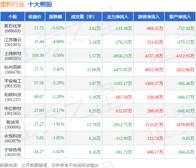 个股表现方面,塑料行业当日领跌股为聚石化学(688669),该股当日报收21.75,下跌5.02%,成交量3.62万,主力资金净流出131.38万元。江苏博云(301003)以下跌4.0%紧随其后,该股当日成交量2.24万,主力资金净流出276.25万元。除此之外,上纬新材(688585)、杭州高新(300478)、平安电工(001359)均进入当日熊股之列。具体个股列表见下表:
