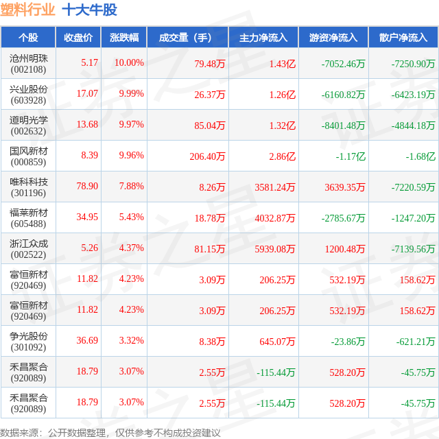 个股表现方面,塑料行业当日领涨股为沧州明珠(002108),该股当日报收5.17,上涨10.0%,成交量79.48万,主力资金净流入1.43亿元。兴业股份(603928)以上涨9.99%紧随其后,该股当日成交量26.37万,主力资金净流入1.26亿元。除此之外,道明光学(002632)、国风新材(000859)、唯科科技(301196)均进入当日牛股之列。具体个股列表见下表: