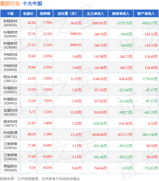 个股表现方面,橡胶行业当日领涨股为彤程新材(603650),该股当日报收42.66,上涨7.7%,成交量36.03万,主力资金净流入8305.02万元。科隆新材(920098)以上涨2.21%紧随其后,该股当日成交量9070.0,主力资金净流入240.7万元。除此之外,科隆新材(920098)、中裕科技(920694)、中裕科技(920694)均进入当日牛股之列。具体个股列表见下表: