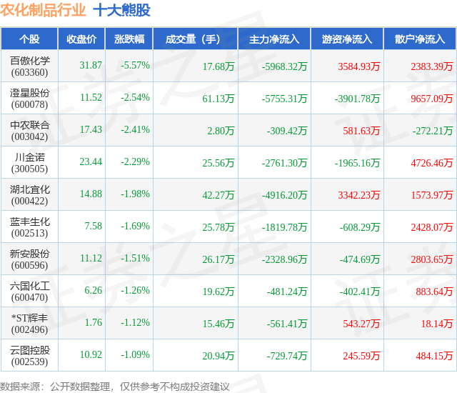 个股表现方面,农化制品行业当日领跌股为百傲化学(603360),该股当日报收31.87,下跌5.57%,成交量17.68万,主力资金净流出5968.32万元。澄星股份(600078)以下跌2.54%紧随其后,该股当日成交量61.13万,主力资金净流出5755.31万元。除此之外,中农联合(003042)、川金诺(300505)、湖北宜化(000422)均进入当日熊股之列。具体个股列表见下表: