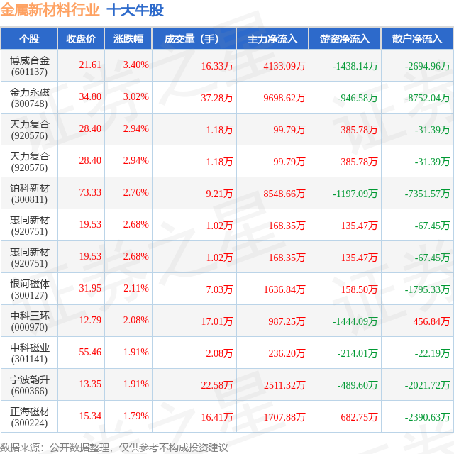 个股表现方面,金属新材料行业当日领涨股为博威合金(601137),该股当日报收21.61,上涨3.4%,成交量16.33万,主力资金净流入4133.09万元。金力永磁(300748)以上涨3.02%紧随其后,该股当日成交量37.28万,主力资金净流入9698.62万元。除此之外,天力复合(920576)、天力复合(920576)、铂科新材(300811)均进入当日牛股之列。具体个股列表见下表: