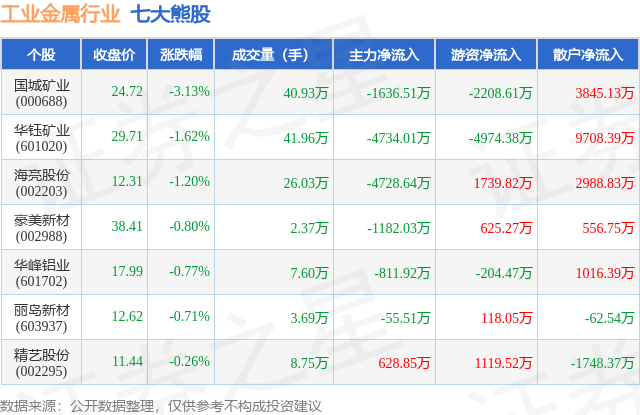个股表现方面,工业金属行业当日领跌股为国城矿业(000688),该股当日报收24.72,下跌3.13%,成交量40.93万,主力资金净流出1636.51万元。华钰矿业(601020)以下跌1.62%紧随其后,该股当日成交量41.96万,主力资金净流出4734.01万元。除此之外,海亮股份(002203)、豪美新材(002988)、华峰铝业(601702)均进入当日熊股之列。具体个股列表见下表: