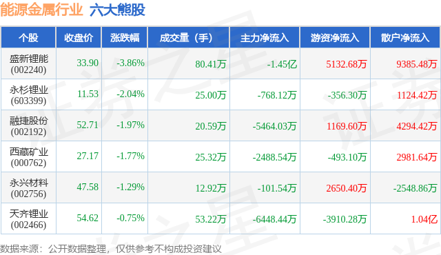 个股表现方面,能源金属行业当日领跌股为盛新锂能(002240),该股当日报收33.9,下跌3.86%,成交量80.41万,主力资金净流出1.45亿元。永杉锂业(603399)以下跌2.04%紧随其后,该股当日成交量25.0万,主力资金净流出768.12万元。除此之外,融捷股份(002192)、西藏矿业(000762)、永兴材料(002756)均进入当日熊股之列。具体个股列表见下表: