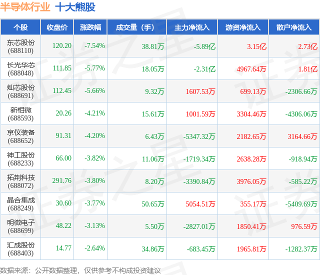 个股表现方面,半导体行业当日领跌股为东芯股份(688110),该股当日报收120.2,下跌7.54%,成交量38.81万,主力资金净流出5.89亿元。长光华芯(688048)以下跌5.77%紧随其后,该股当日成交量18.05万,主力资金净流出2.31亿元。除此之外,灿芯股份(688691)、新相微(688593)、京仪装备(688652)均进入当日熊股之列。具体个股列表见下表: