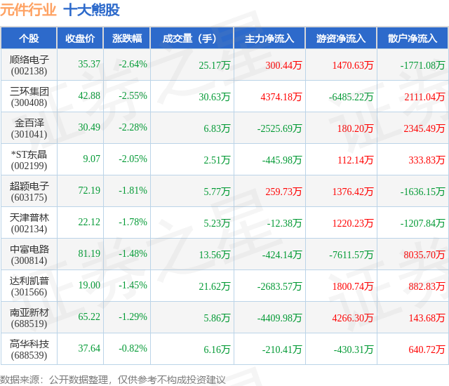 个股表现方面,元件行业当日领跌股为顺络电子(002138),该股当日报收35.37,下跌2.64%,成交量25.17万,主力资金净流入300.44万元。三环集团(300408)以下跌2.55%紧随其后,该股当日成交量30.63万,主力资金净流入4374.18万元。除此之外,金百泽(301041)、*ST东晶(002199)、超颖电子(603175)均进入当日熊股之列。具体个股列表见下表: