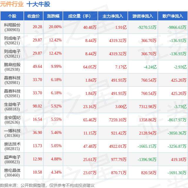个股表现方面,元件行业当日领涨股为科翔股份(300903),该股当日报收20.28,上涨20.0%,成交量40.48万,主力资金净流入1.91亿元。则成电子(920821)以上涨12.42%紧随其后,该股当日成交量8.44万,主力资金净流入4319.32万元。除此之外,则成电子(920821)、鹏鼎控股(002938)、晶赛科技(920981)均进入当日牛股之列。具体个股列表见下表: