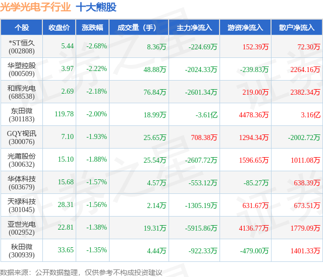 个股表现方面,光学光电子行业当日领跌股为*ST恒久(002808),该股当日报收5.44,下跌2.68%,成交量8.36万,主力资金净流出224.69万元。华塑控股(000509)以下跌2.22%紧随其后,该股当日成交量48.88万,主力资金净流出2024.33万元。除此之外,和辉光电(688538)、东田微(301183)、GQY视讯(300076)均进入当日熊股之列。具体个股列表见下表: