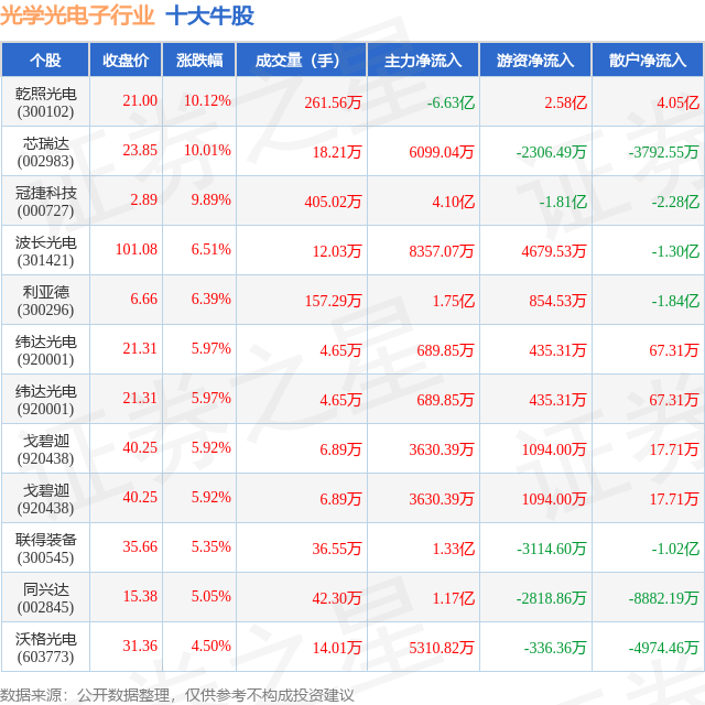个股表现方面,光学光电子行业当日领涨股为乾照光电(300102),该股当日报收21.0,上涨10.12%,成交量261.56万,主力资金净流出6.63亿元。芯瑞达(002983)以上涨10.01%紧随其后,该股当日成交量18.21万,主力资金净流入6099.04万元。除此之外,冠捷科技(000727)、波长光电(301421)、利亚德(300296)均进入当日牛股之列。具体个股列表见下表: