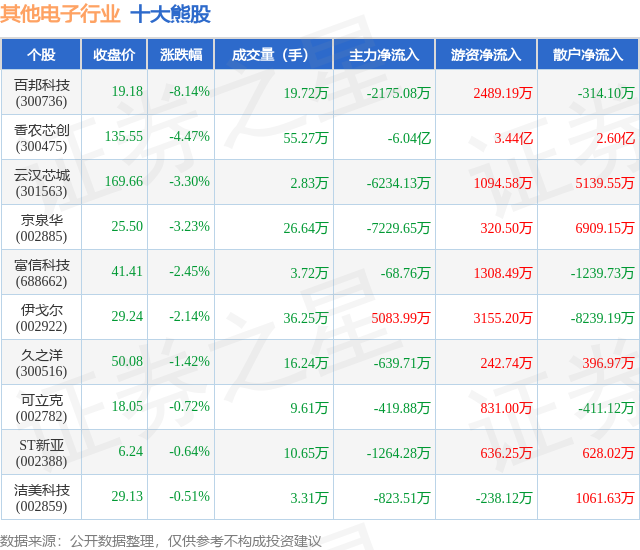 个股表现方面,其他电子行业当日领跌股为百邦科技(300736),该股当日报收19.18,下跌8.14%,成交量19.72万,主力资金净流出2175.08万元。香农芯创(300475)以下跌4.47%紧随其后,该股当日成交量55.27万,主力资金净流出6.04亿元。除此之外,云汉芯城(301563)、京泉华(002885)、富信科技(688662)均进入当日熊股之列。具体个股列表见下表: