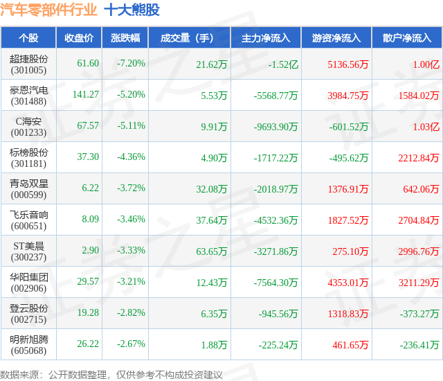 个股表现方面,汽车零部件行业当日领跌股为超捷股份(301005),该股当日报收61.6,下跌7.2%,成交量21.62万,主力资金净流出1.52亿元。豪恩汽电(301488)以下跌5.2%紧随其后,该股当日成交量5.53万,主力资金净流出5568.77万元。除此之外,C海安(001233)、标榜股份(301181)、青岛双星(000599)均进入当日熊股之列。具体个股列表见下表: