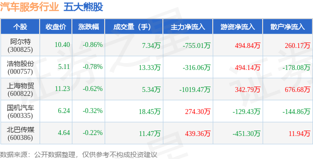 个股表现方面,汽车服务行业当日领跌股为阿尔特(300825),该股当日报收10.4,下跌0.86%,成交量7.34万,主力资金净流出755.01万元。浩物股份(000757)以下跌0.78%紧随其后,该股当日成交量13.33万,主力资金净流出316.06万元。除此之外,上海物贸(600822)、国机汽车(600335)、北巴传媒(600386)均进入当日熊股之列。具体个股列表见下表: