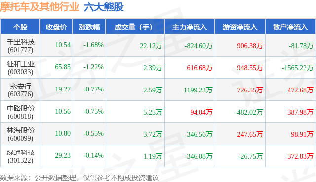 个股表现方面,摩托车及其他行业当日领跌股为千里科技(601777),该股当日报收10.54,下跌1.68%,成交量22.12万,主力资金净流出824.6万元。征和工业(003033)以下跌1.22%紧随其后,该股当日成交量2.39万,主力资金净流入616.68万元。除此之外,永安行(603776)、中路股份(600818)、林海股份(600099)均进入当日熊股之列。具体个股列表见下表: