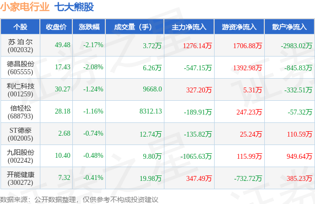 个股表现方面,小家电行业当日领跌股为苏 泊 尔(002032),该股当日报收49.48,下跌2.17%,成交量3.72万,主力资金净流入1276.14万元。德昌股份(605555)以下跌2.08%紧随其后,该股当日成交量6.26万,主力资金净流出547.15万元。除此之外,利仁科技(001259)、倍轻松(688793)、ST德豪(002005)均进入当日熊股之列。具体个股列表见下表:
