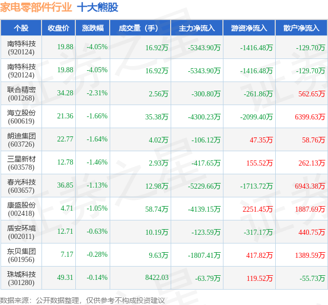 个股表现方面,家电零部件行业当日领跌股为南特科技(920124),该股当日报收19.88,下跌4.05%,成交量16.92万,主力资金净流出5343.9万元。南特科技(920124)以下跌4.05%紧随其后,该股当日成交量16.92万,主力资金净流出5343.9万元。除此之外,联合精密(001268)、海立股份(600619)、朗迪集团(603726)均进入当日熊股之列。具体个股列表见下表: