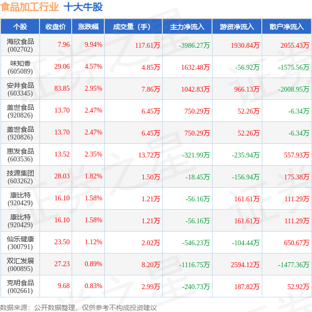 个股表现方面,食品加工行业当日领涨股为海欣食品(002702),该股当日报收7.96,上涨9.94%,成交量117.61万,主力资金净流出3986.27万元。味知香(605089)以上涨4.57%紧随其后,该股当日成交量4.85万,主力资金净流入1632.48万元。除此之外,安井食品(603345)、盖世食品(920826)、盖世食品(920826)均进入当日牛股之列。具体个股列表见下表: